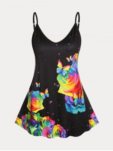 s*****s4Plus Size & Curve Rainbow Rose Butterfly Print Flowy Cami Top (Adjustable Straps)Color: BLACK Size: XLto big but I belive its on me because I've lost weight and didn't realize how much smaller I am so I bought them thinking it was still my size. rosegal app is great I love their cholthes and would definitely buy from them over and over again as I have. their cholthes are cute and nobody else you know has them.