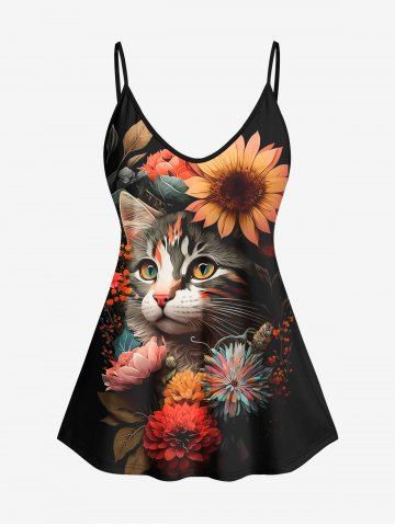 Graphic Tanks > Plus Size Cute Cat Flower Print Backless Cami Top(Adjustable Shoulder Strap)