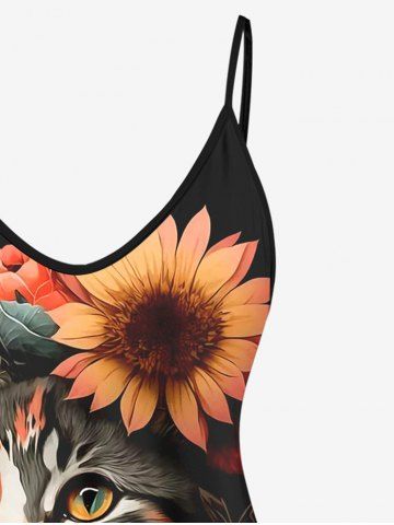 Graphic Tanks > Plus Size Cute Cat Flower Print Backless Cami Top(Adjustable Shoulder Strap)