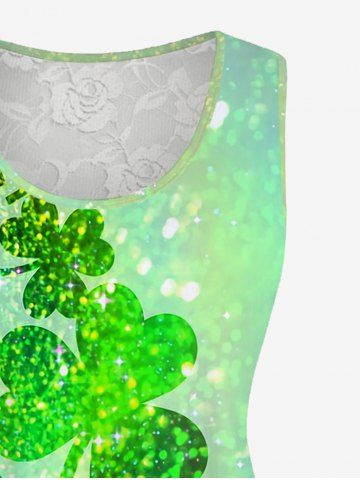 Plus Size Glitter Sparkling Ombre Lucky Four Leaf Clover Floral Lace Print Sleeveless Tank Top - Green - M