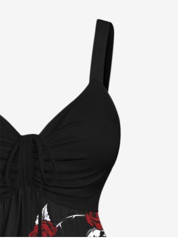 Plus Size Rose Flower Leaf Print Cinched Tank Top - Black - Xs