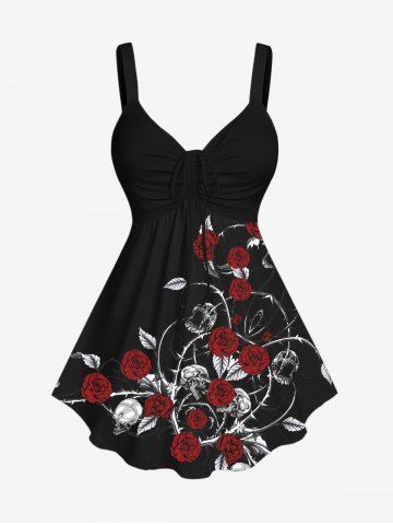 Plus Size Rose Flower Leaf Print Cinched Tank Top - Black - M