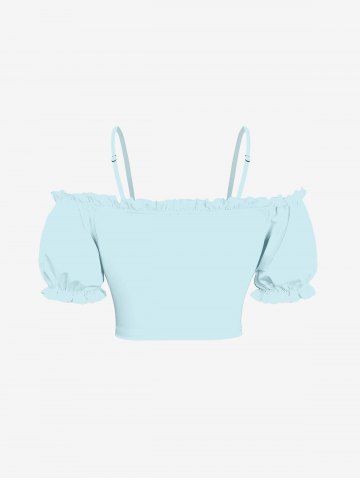 Plus Size Ruched Cinched Ruffles Cold Shoulder Cami Top - Light Blue - S