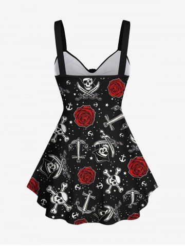 Plus Size Skulls Rose Flower Anchor Print Cinched Tank Top - Black - 4x