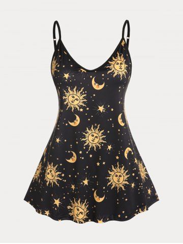 Plus Size Sun Moon Star Print Cami Top (Adjustable Shoulder Strap) - Black - 1x