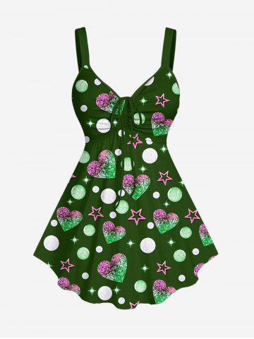 Plus Size Valentine's Day Heart Moon Star Colorblock Glitter Sparkling Sequin 3D Print Cinched Tank Top - Deep Green - 1x