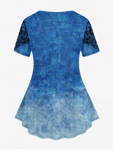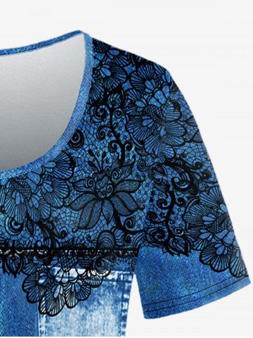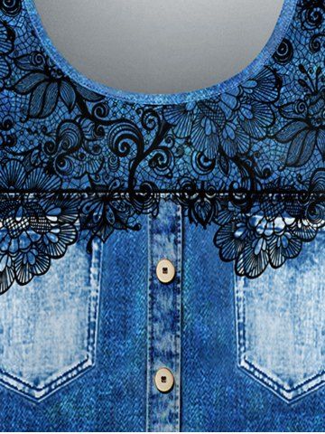 Plus Size 3D Appliques Denim Pockets Buttons Printed T-shirt - Blue - S