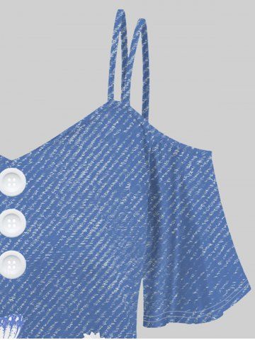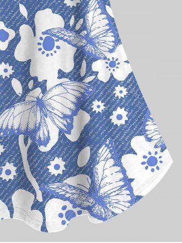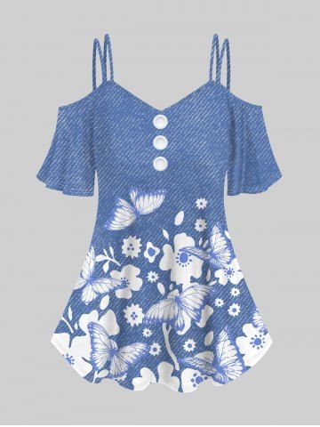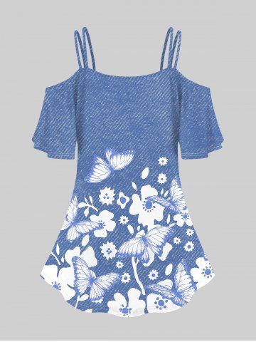 Plus Size 3D Butterfly Floral Print Cold Shoulder T-shirt - Blue - L | Us 12