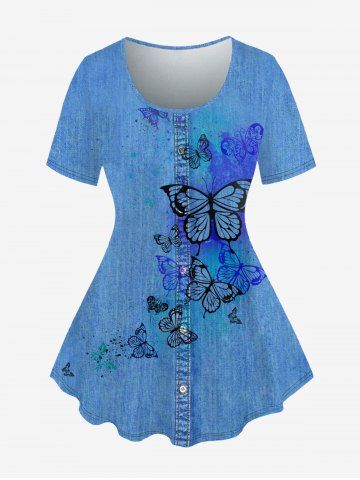 n*****a5Plus Size 3D Butterfly Print Jeans Button Round Neck T-ShirtColor: BLUE Size: 2X | US 18-20I'm not a big fan of flashy clothes and this is right up my alley. The fabric is so soft I want to wear this tunic all the time. It lets the air flow and keeps me cool.