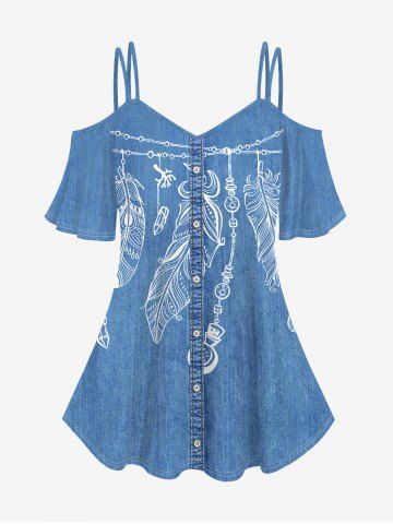 Graphic Tees > Plus Size 3D Jeans Buttons And Chains Leaves Feather Print Strap Off Shoulder Tee