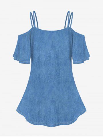 Plus Size 3D Jeans Buttons And Chains Leaves Feather Print Strap Off Shoulder Tee - Light Blue - L | Us 12