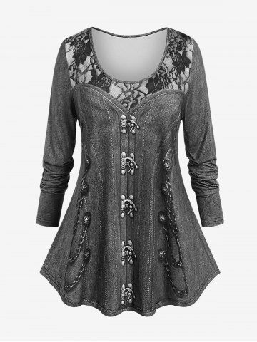Graphic Tees > Plus Size 3D Jeans Chains Lace Printed Long Sleeves Tee