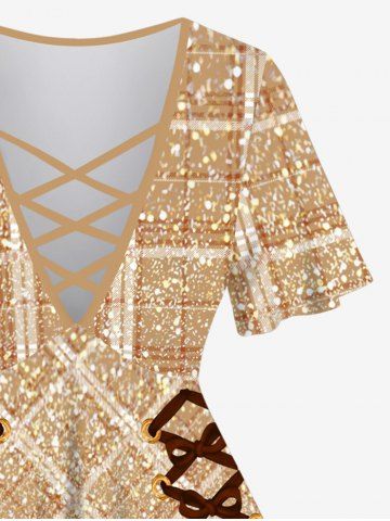Plus Size 3D Lace Up Ombre Plaid Painting Splatter Print Lattice Top - Light Coffee - 3x