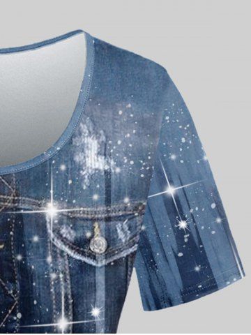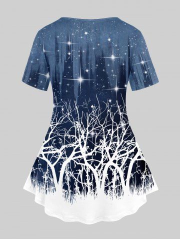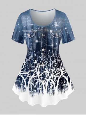 Plus Size 3D Pockets Buttons Glitter Tree Print T-shirt - Deep Blue - 1x