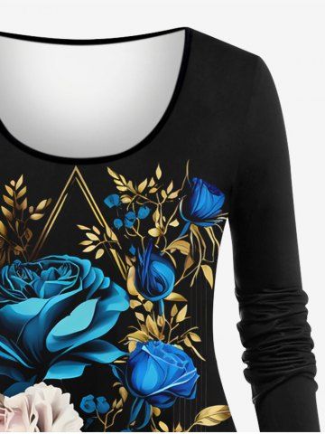 Plus Size 3D Rose Flower Leaf Print Long Sleeves Valentines T-shirt - Blue - M