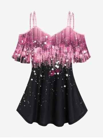 m*****15Plus Size 3D Sparkling Sequin Light Beam Print Cold Shoulder Tops and Flare Pants Disco 70s 80s OutfitColor: LIGHT PINKjust to cute again i like my outfit the colors are blend in well with the black. quality is very nice⭐⭐⭐⭐⭐