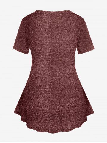 Plus Size 3D Sunflowers Print Hole Button Denim Short Sleeve T-Shirt - Deep Red - L | Us 12