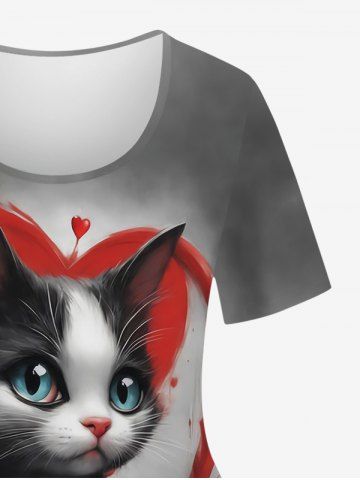 Plus Size Bloody Heart Fluffy Cat Ombre Tie Dye Print Valentines Short Sleeves T-shirt - Gray - 6x