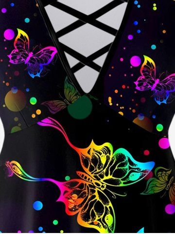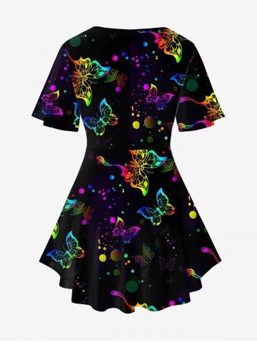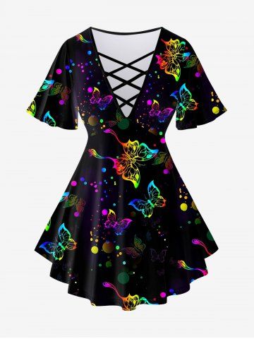 Plus Size Butterfly Dot Print Crisscross V Neck Short Sleeve T-Shirt - Black - 1x | Us 14-16