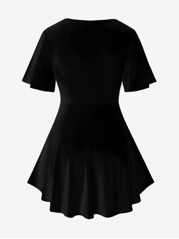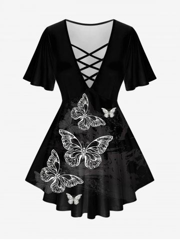 K*****e4Plus Size 3D Crisscross V-Neck Butterfly Lace Up Print Short-Sleeved T-ShirtColor: BLACK Size: 3X | US 22-24Very cute shirt, it definitely is low cut in the front something that is to low for me. It also took a long time to get here compared to other items I've bought in the past.