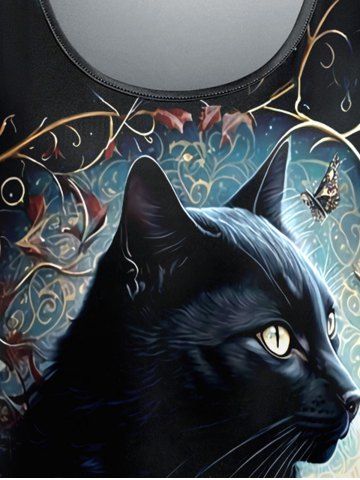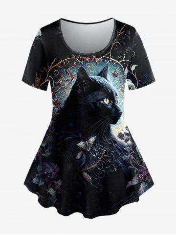 Plus Size Cat Flower Butterfly Print T-shirt - Black - S