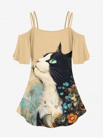 Plus Size Cat Flower Printed Cold Shoulder Women Cami T-shirt - Apricot - 1x
