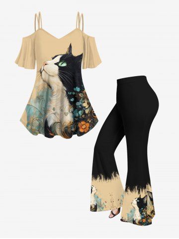 Graphic Tees > Plus Size Cat Flower Printed Cold Shoulder Women Cami T-shirt