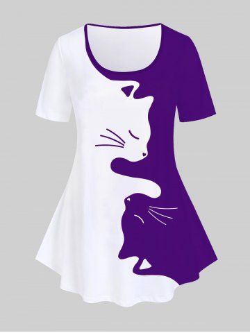 Plus Size Cat Pattern Two Tone Short Sleeves Tee - Purple - 4x | Us 26-28