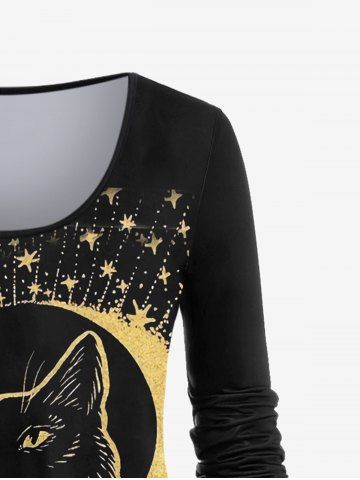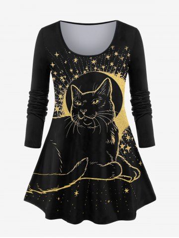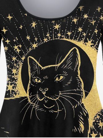 D*****n5Plus Size Cat Print Starry Print T-shirtColor: BLACK Size: 1X | US 14-16Gorgeous. Fits perfectly and is very flattering. Flows and shows your curves beautifully. The chest is lower cut than I prefer so I wear a tank underneath for more modesty