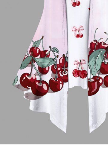 Graphic Tees > Plus Size Cherry Leaf Bowknot Print Patchwork Ombre 2 in 1 Women T-shirt
