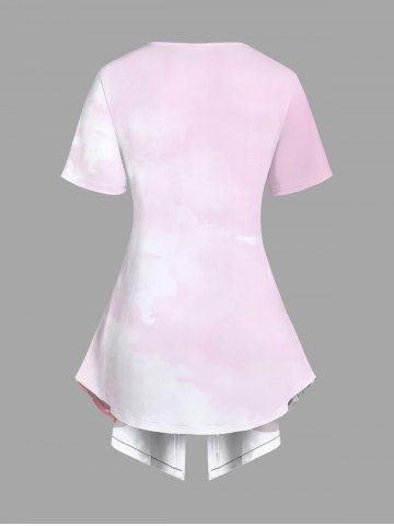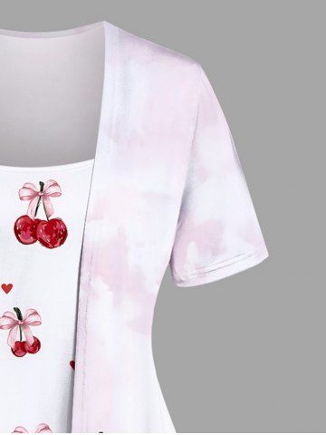 Plus Size Cherry Leaf Bowknot Print Patchwork Ombre 2 in 1 Women T-shirt - Light Pink - 5x
