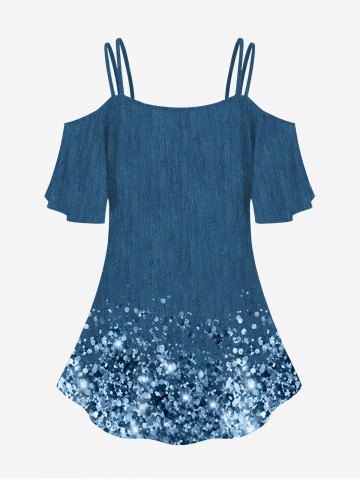 Plus Size Cold Shoulder 3D Glitter Sparkling Sequins Buttons Pearl Pocket Denim Print Ombre T-shirt - Blue Gray - L