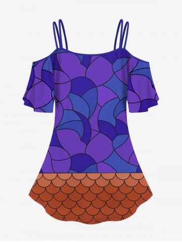 Plus Size Cold Shoulder Cat Fish Scale Moon Cloud Colorblock Print Cami T-shirt - Purple - Xs