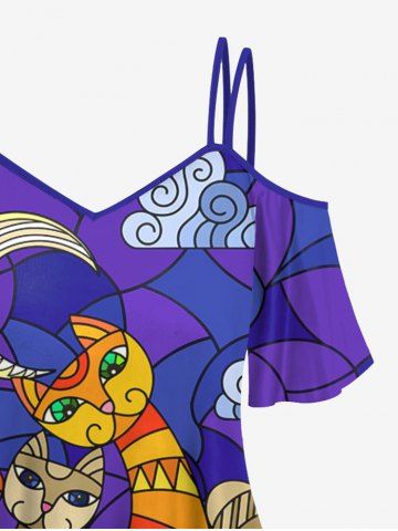 Plus Size Cold Shoulder Cat Fish Scale Moon Cloud Colorblock Print Cami T-shirt - Purple - 4x