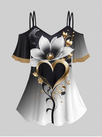 Plus Size Cold Shoulder Heart Flower Print Ombre Cami T-shirt