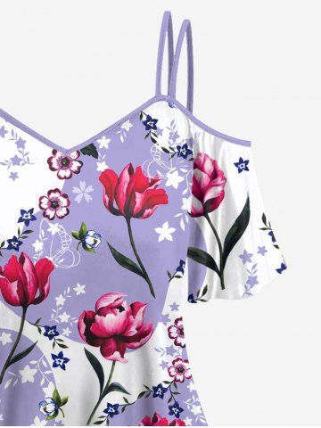 Plus Size Cold Shoulder Rose Flower Butterfly Stars Colorblock Print Cami T-shirt - Light Purple - 1x