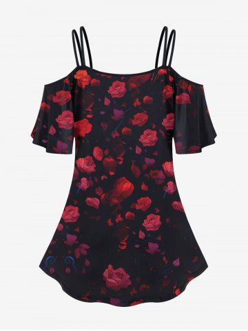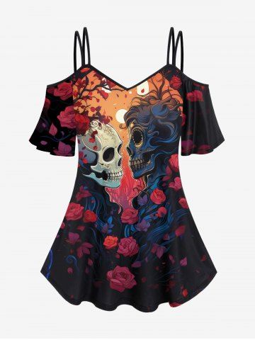 Plus Size Cold Shoulder Skull Lovers Ombre Rose Flower Moon Print Cami T-shirt - Black - Xs