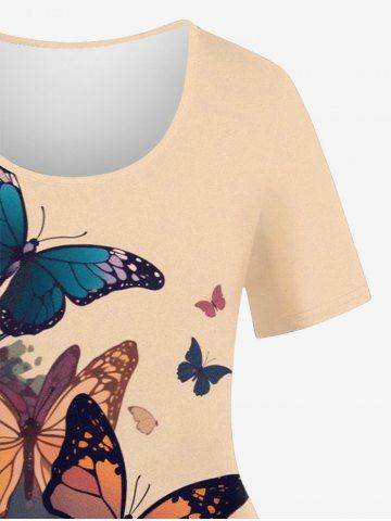 Plus Size Colorblock Butterfly Plant Print T-shirt - Light Coffee - S