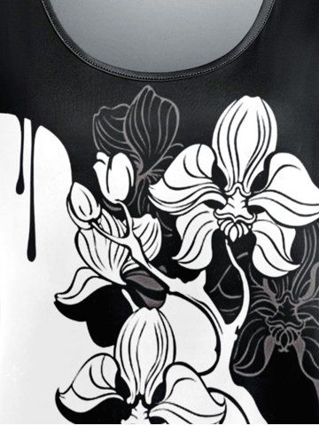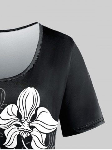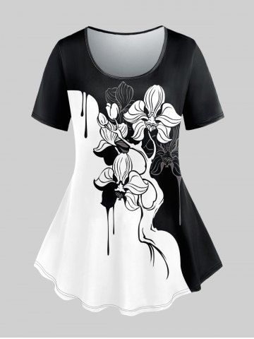 Plus Size Colorblock Flower Print Short Sleeves T-shirt - Black - 6x