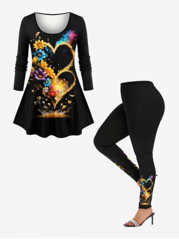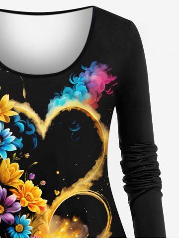 Plus Size Colorful Flower Heart Smoke Fireworks Print Valentines Long Sleeves T-shirt - Black - Xs