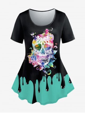 Plus Size Colorful Flower Heart Star Skull Paint Drop Print Short Sleeves T-shirt - Black - 4x