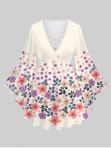 Graphic Tees > Plus Size Colorful Peach Blossom Flowers Leaf Print Lattice Crisscross Flare Sleeve Top