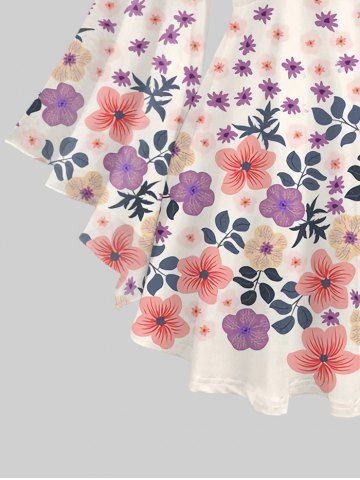 Plus Size Colorful Peach Blossom Flowers Leaf Print Lattice Crisscross Flare Sleeve Top - Multi-a - 6x