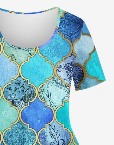 Plus Size Cool Jade Decorative Moroccan Pattern Bird Butterfly Floral Print T-shirt - Blue - 4x