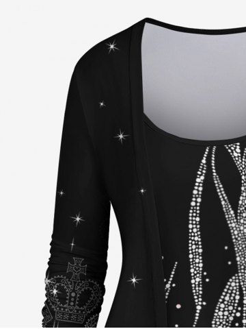 Plus Size Crown Leaf Glitter Sparkling Print Patchwork 2 in 1 T-shirt - Black - 4x