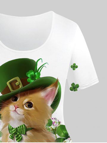 Plus Size Cute Cat Hat Lucky Four Leaf Clover Flower Print St. Patrick's Day T-shirt - White - Xs