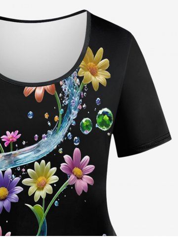 Plus Size Daisy Flower Water Print Short Sleeves T-shirt - Black - 6x