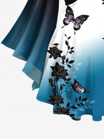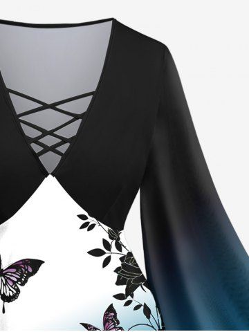 Graphic Tees > Plus Size Flare Sleeves Butterfly Floral Leaf Print Ombre Lattice Top