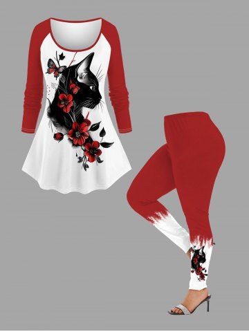 Graphic Tees > Plus Size Floral Butterfly Cat Print Raglan Sleeves T-shirt