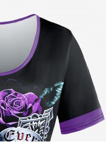 Plus Size Floral Letter Print Short Sleeves T-shirt - Black - 6x